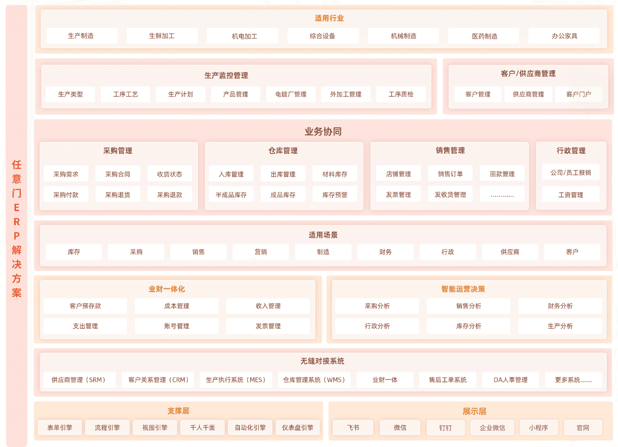 揭示ERP产品的核心业务架构,我们的模块化设计旨在打造一个灵活、可扩展的智慧生态系统,以支持您的企业战略,实现业务流程的优化与创新。